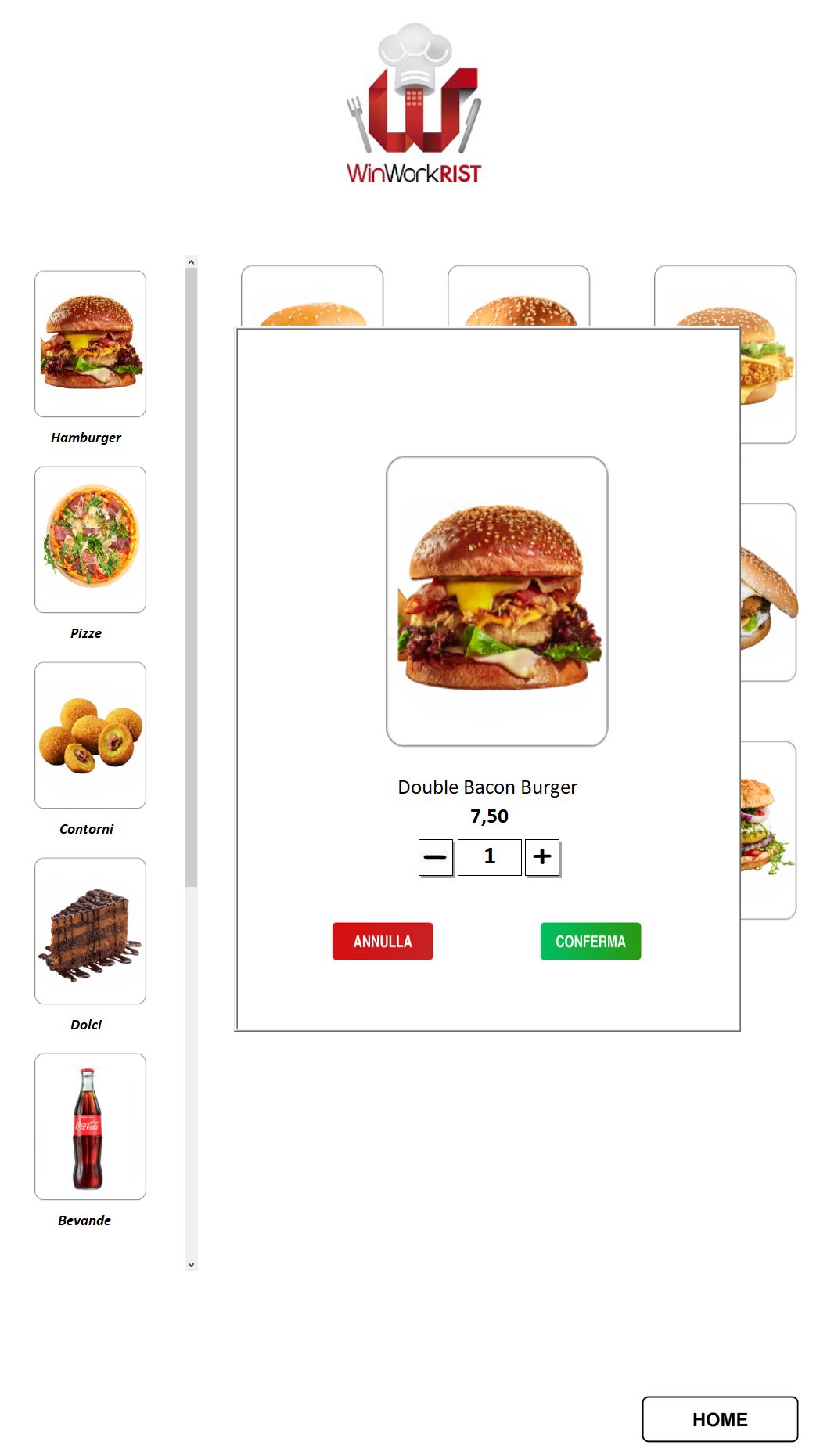 Sullo schermo vengono mostrate tutte le categorie di pietanze disponibili. Selezionando una categoria, l’utente può scegliere le pietanze. E’ possibile modificare gli ingredienti (aggiunta o rimozione), con il calcolo automatico di eventuali sovrapprezzi.