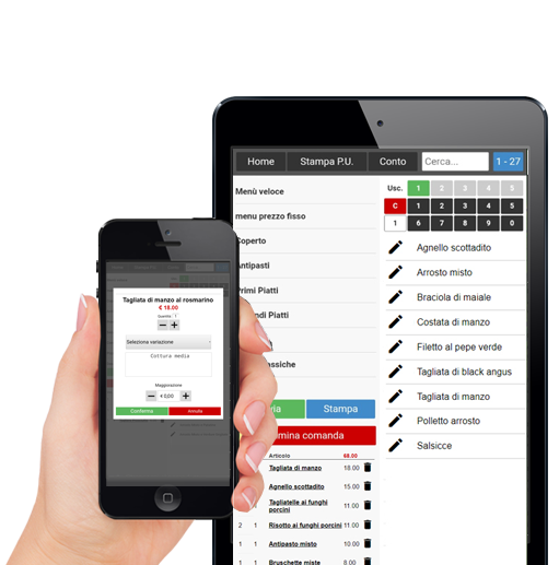 La comanda viene presa tramite smartphone e tablet selezionando i piatti da un'interfaccia semplice ed intuitiva con la possibilità di gestire velocemente qualsiasi tipologia di variazione richiesta dal cliente. Il conto, già pronto alla cassa, si stampa con un click.