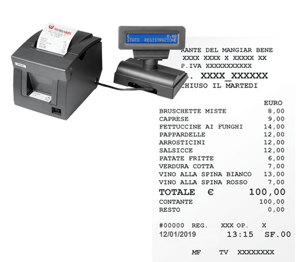 La stampa del conto può essere effettuata su classiche stampanti laser o inkjet. Nel caso in cui già disponi di una stampante di questo tipo basterà sincronizzarla con il gestionale. Le ricevute, personalizzabili, verranno fornite già fiscalizzate.